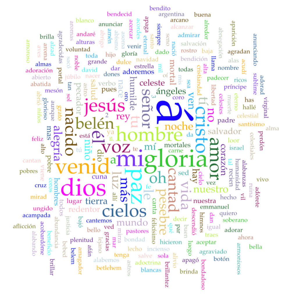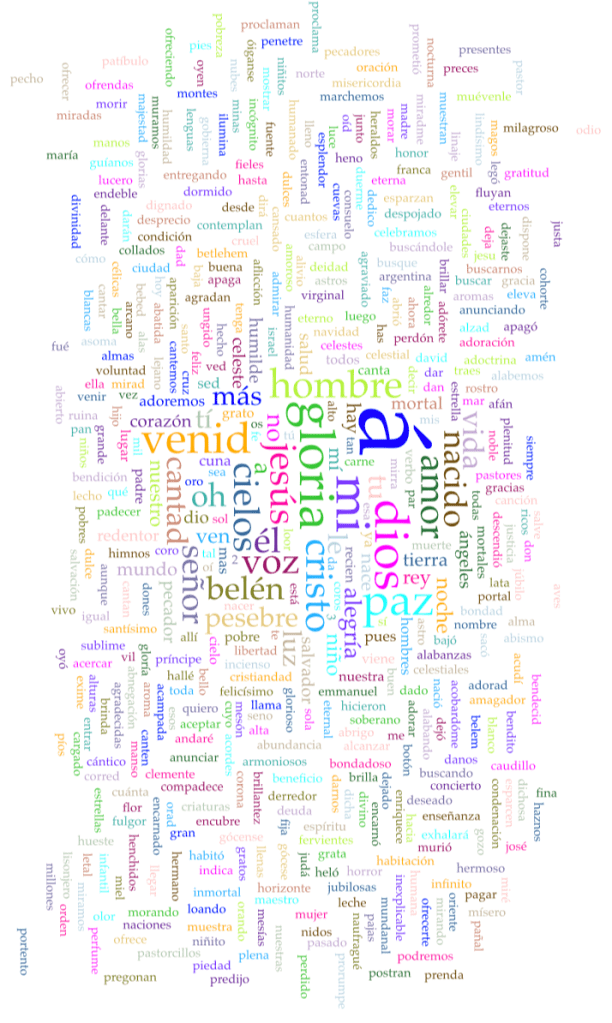 Digital text analysis tools as the one employed here are very useful in the field of hymnology as they can shed new light in . In the Christian Protestant hymnic tradition, text has traditionally superseded music in terms of importance as music has customarily been regarded as an auxiliary means of transmitting the religious message of the Christian gospel. The figures below showcase the results of a CIRRUS (word cloud) text-search feature employed to look at the hymn texts categorized as pertaining to the Nativity of Jesus Christ in the hymnal Himnos Evangélicos (1895). This sample is taken from a total of 18 hymns. By looking at the Cirrus word cloud in the upper left-side corner of Figure 1 or at the three images of Figure 2, we can see that the size of the words correspond to their frequency in the total sample of the 18 Nativity-themed hymns. The most common word is “á,” a preposition with several translations, most notably ‘to,’ that understandably occupies the highest frequency echelon. This is followed by the words “gloria” or ‘glory’ (20 times), “dios” or ‘god’ (18 times), “mí” or ‘me’ (16 times), and “paz” or ‘peace’ (15 times), which stands together in number with “venid” or ‘come.’ Other words that appear frequently are Christ, heavens, love, born, man, Bethlehem, and sing, all related to the Nativity-theme. I think that a very interesting underlying theme is the personal-individual approach of the text in terms of the relationship of God and believer. The frequency of the word ‘me’ showcases the individuality aspect of missional theology in the 19th century, a dogma that has since dwindled in mainline Protestant theology. One other interesting element is the frequency of Christian ‘virtues’ such as love, peace, life, and light, and the author’s intention to connect these to the birth of Jesus Christ. Words relating to the messianic-redemptory message such as salvation, liberty, redemption, and mortals appear as a secondary theme after the “virtue words.” Ultimately, the salvation message is always present, as one would expect from hymns published during the turn of the twentieth century, but the overall theme is actually concentrated in a worship-focused message and a storytelling-focused message.
